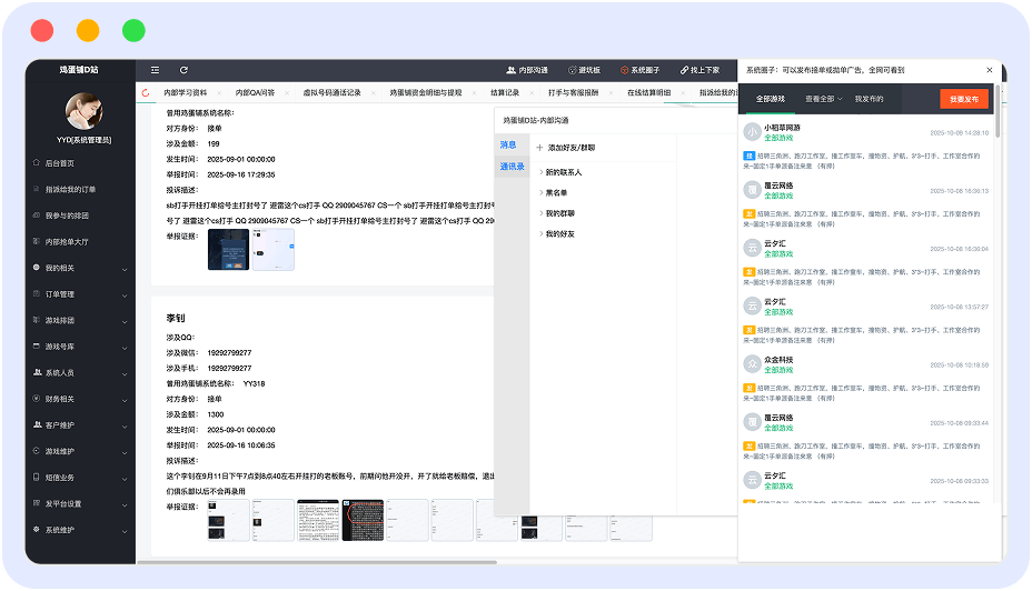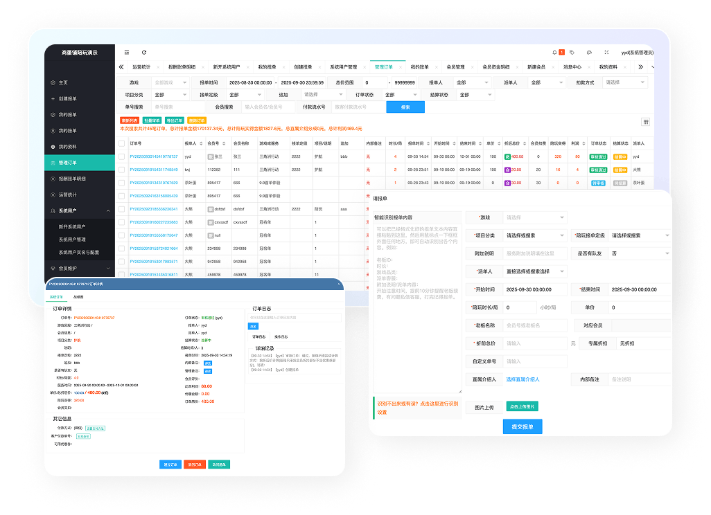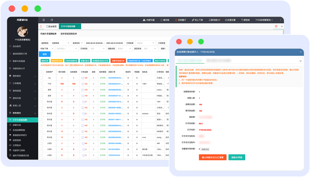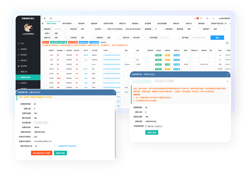 告别繁琐手工记账!订单分配、金额、抽成、结算状态、利润核算……以往这些令人头疼的流水账,现在用“鸡蛋铺陪玩管理系统”一键搞定。数据清晰可视,财务了如指掌,让您高效管理,省心更安心