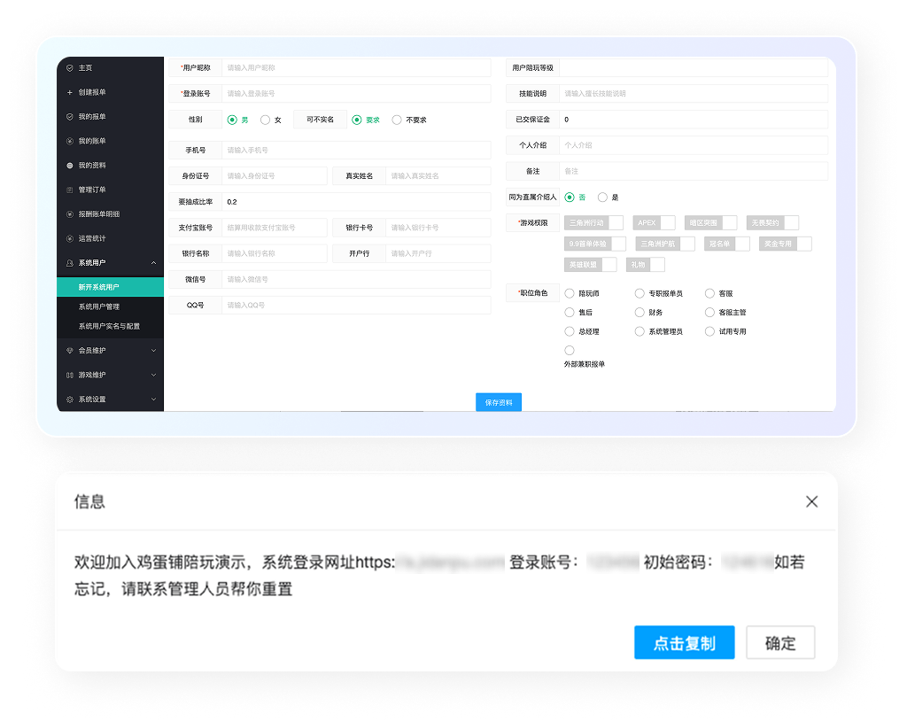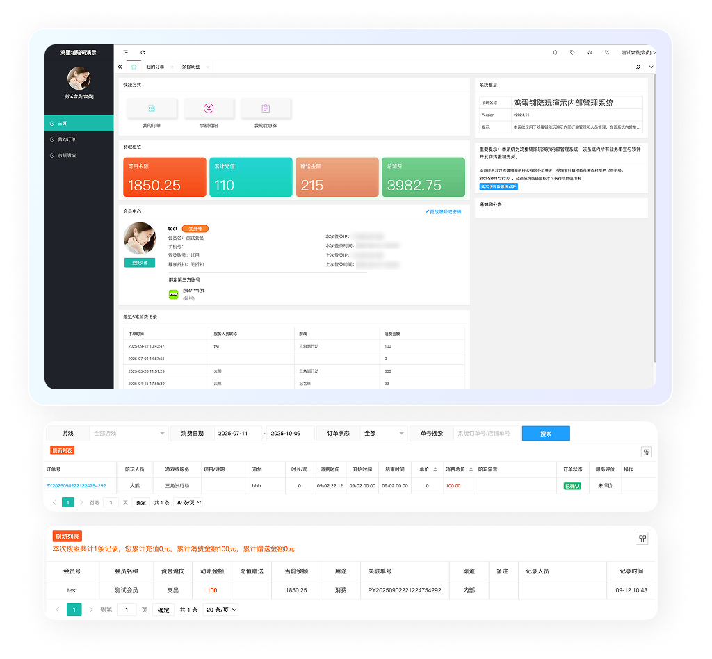 陪玩老板可以建立自己的账号、登录系统,可以查看自己的订单、消费记录、余额变动,与俱乐部建立更深度良好的关系