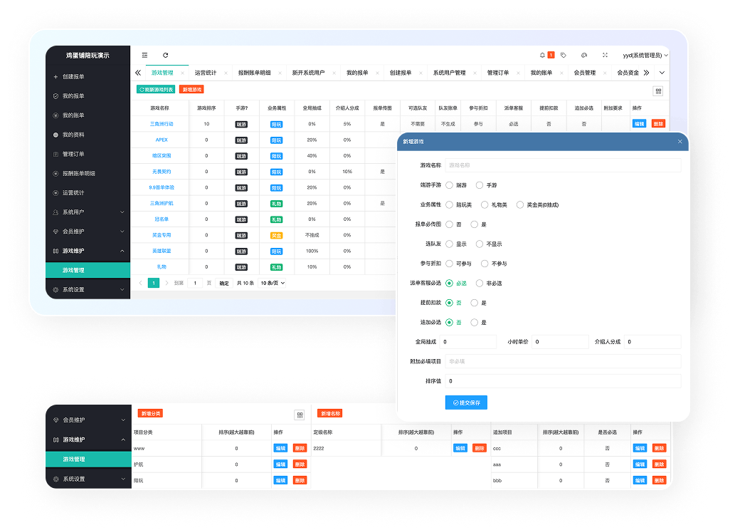 求系统支持工作室对旗下游戏业务进行管理,可灵活自定义游戏属性、抽成、折扣及项目类型,满足主流市场需求