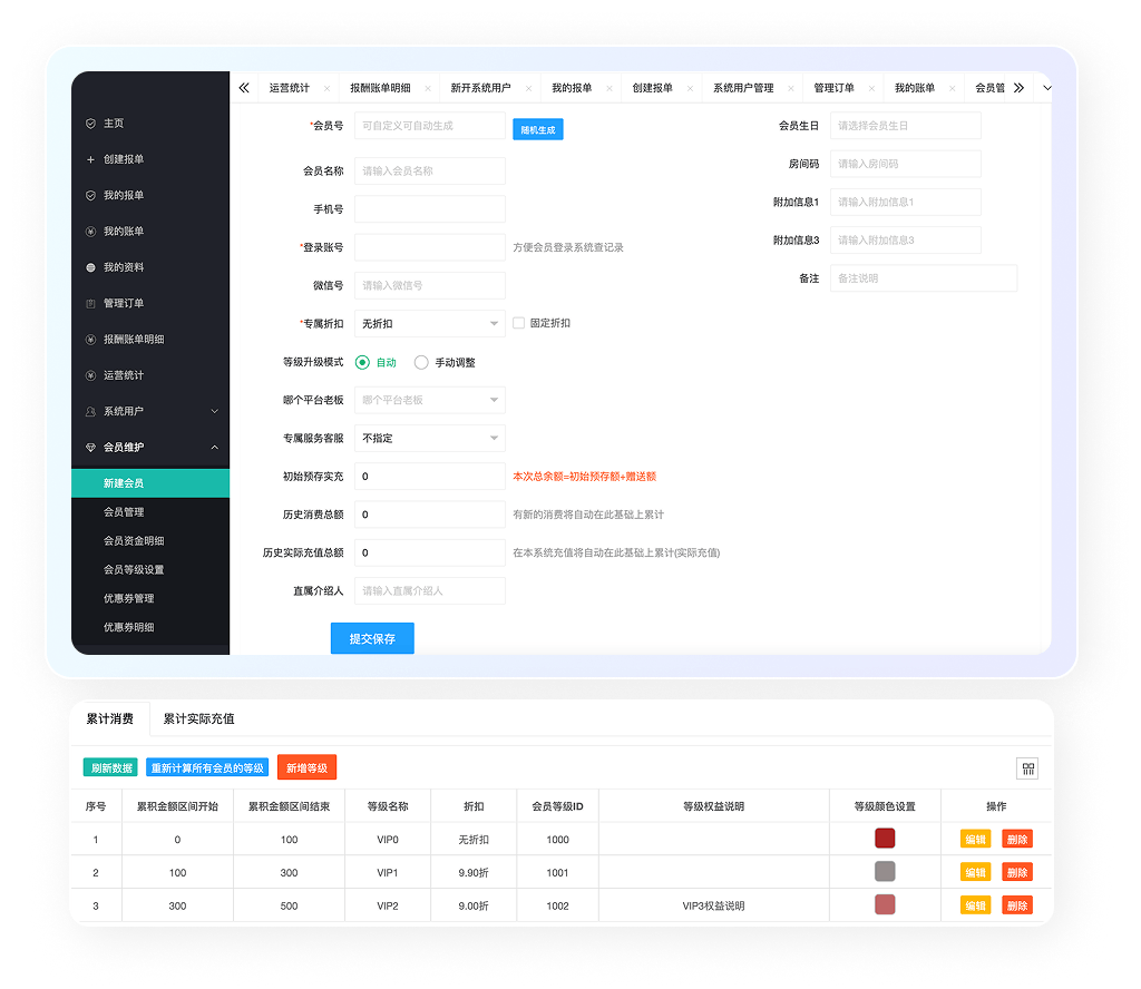 会员账户管理与福利体系一体化,会员可登录查余额、审订单;支持自定义满减、专属折扣、会员等级,兼顾客户服务与运营效率